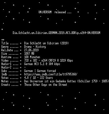 | FiLENAME: | Die.Schlacht.um.Sibirien.GERMAN.2019.AC3.BDRip.x264-UNiVERSUM.mkv |
