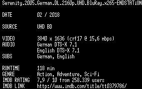 | FiLENAME: | Serenity.2005.German.DL.2160p.UHD.BluRay.x265-ENDSTATiON.mkv |