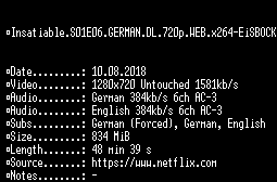 | FiLENAME: | Insatiable.S01E06.GERMAN.DL.720p.WEB.x264-EiSBOCK.mkv |
