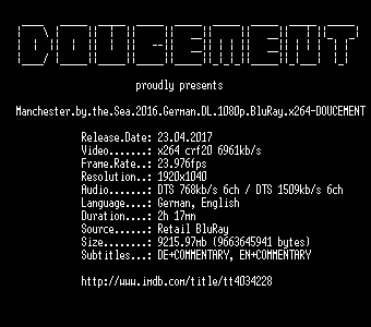 | FiLENAME: | Manchester.by.the.Sea.2016.German.DL.1080p.BluRay.x264-DOUCEMENT.mkv |