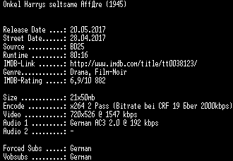 | FiLENAME: | Onkel.Harrys.seltsame.Affaere.German.REMASTERED.1945.AC3.BDRip.x264-SPiCY.mkv |