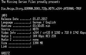 | FiLENAME: | Die.Amiga.Story.GERMAN.DOKU.720p.HDTV.x264-iNTERNAL-TMSF.mkv |