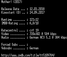 | FiLENAME: | Mother.German.2017.AC3.BDRip.x264-COiNCiDENCE.mkv |