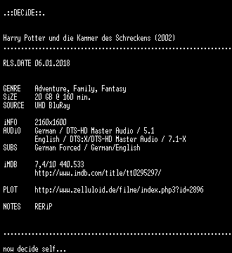 | FiLENAME: | Harry.Potter.und.die.Kammer.des.Schreckens.2002.GERMAN.DL.2160p.UHD.BluRay.x265.RERiP-DECiDE.mkv |