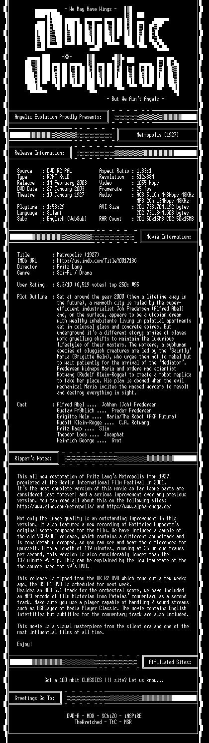 | FiLENAME: | Metropolis.1927.REMASTERED.CD1.DVDRip.XviD-AEN.avi |