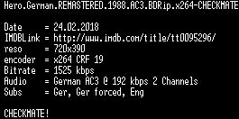 | FiLENAME: | Hero.German.REMASTERED.1988.AC3.BDRip.x264-CHECKMATE.mkv |
