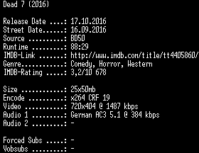 | FiLENAME: | Dead.7.German.2016.AC3.BDRip.x264-SPiCY.mkv |