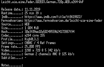 | FiLENAME: | Leicht.wie.eine.Feder.S02E03.German.720p.WEB.x264-WvF.mkv |
