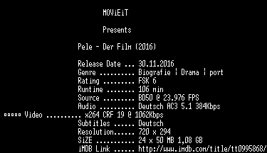 | FiLENAME: | Pele.Der.Film.German.2016.AC3.BDRip.x264-MOViEiT.mkv |