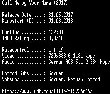 | FiLENAME: | Call.Me.by.Your.Name.German.2017.AC3.BDRip.x264-COiNCiDENCE.mkv |