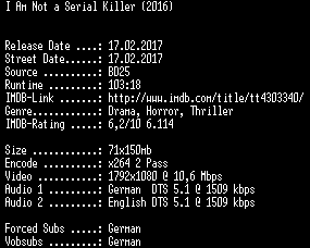 | FiLENAME: | I.Am.Not.a.Serial.Killer.2016.German.DL.1080p.BluRay.x264-SPiCY.mkv |
