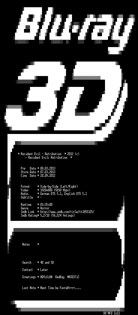 | FiLENAME: | Resident.Evil.Retribution.3D.2012.German.DL.1080p.BluRay.x264-BluRay3D.mkv |