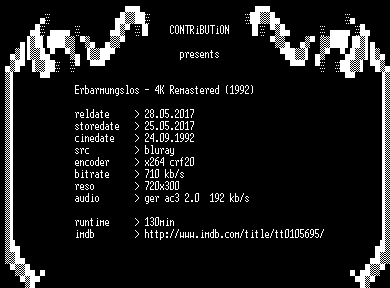 | FiLENAME: | Erbarmungslos.1992.Remastered.German.BDRip.x264-CONTRiBUTiON.mkv |
