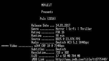| FiLENAME: | Puls.German.2016.AC3.BDRip.x264-MOViEiT.mkv |
