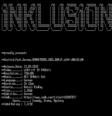 | FiLENAME: | Gosford.Park.German.REMASTERED.2001.BDRiP.x264-iNKLUSiON.mkv |