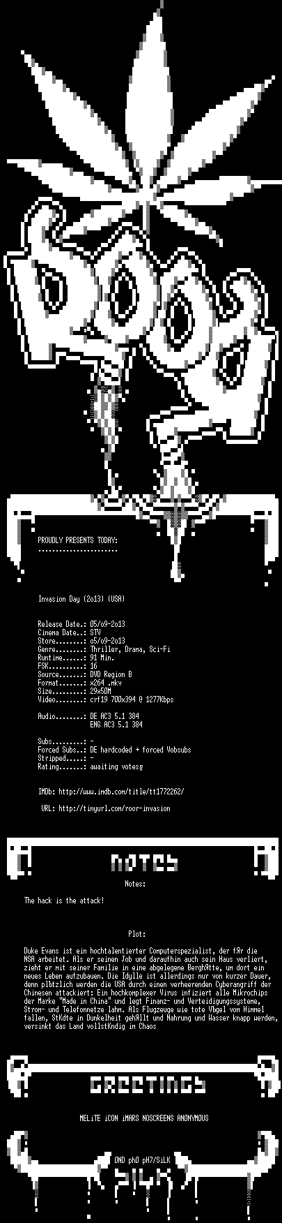 | FiLENAME: | Invasion.Day.German.2013.DL.DVDRiP.x264-ROOR.mkv |