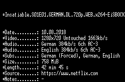 | FiLENAME: | Insatiable.S01E01.GERMAN.DL.720p.WEB.x264-EiSBOCK.mkv |