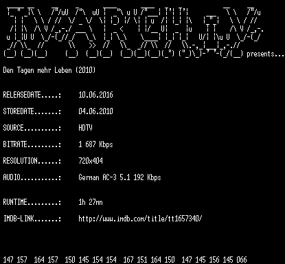 | FiLENAME: | Den.Tagen.mehr.Leben.2010.German.HDTVRip.x264-TVARCHiV.mkv |
