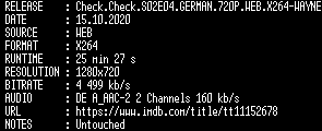 | FiLENAME: | Check.Check.S02E04.GERMAN.720P.WEB.X264-WAYNE.mkv |