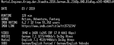 | FiLENAME: | Mortal.Engines.Krieg.der.Staedte.2018.German.DL.2160p.UHD.BluRay.x265-HDMEDiA.mkv |