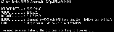 | FiLENAME: | Glitch.Techs.S02E06.German.DL.720p.WEB.x264-OHD.mkv |