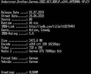 | FiLENAME: | Undercover.Brother.German.2002.AC3.BDRiP.x264.iNTERNAL-SPiCY.mkv |