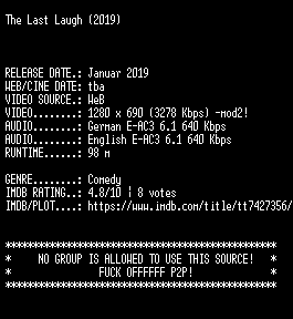 | FiLENAME: | The.Last.Laugh.2019.German.DL.720p.WebHD.x264-SLG.mkv |