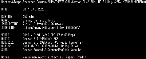 | FiLENAME: | Doctor.Sleeps.Erwachen.German.2019.THEATRiCAL.German.DL.2160p.UHD.BluRay.x265.iNTERNAL-HDMEDiA.mkv |