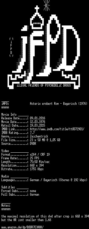 | FiLENAME: | Asterix.erobert.Rom.Bayerische.Fassung.REMASTERED.German.1976.AC3.DVDRiP.x264-iFPD.mkv |