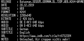 | FiLENAME: | Batwoman.S01E05.GERMAN.DL.720P.WEB.H264-WAYNE.mkv |