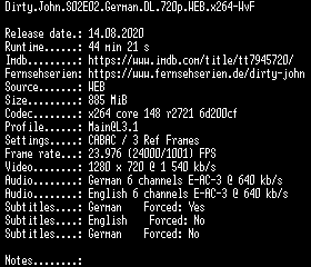 | FiLENAME: | Dirty.John.S02E02.German.DL.720p.WEB.x264-WvF.mkv |