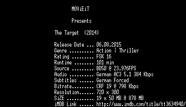 | FiLENAME: | The.Target.German.2014.AC3.BDRip.x264-MOViEiT.mkv |