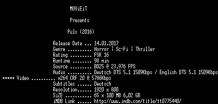 | FiLENAME: | Puls.2016.German.DL.1080p.BluRay.x264-MOViEiT.mkv |