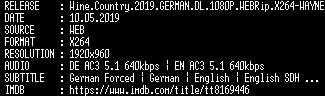 | FiLENAME: | Wine.Country.2019.GERMAN.DL.1080P.WEBRip.X264-WAYNE.mkv |