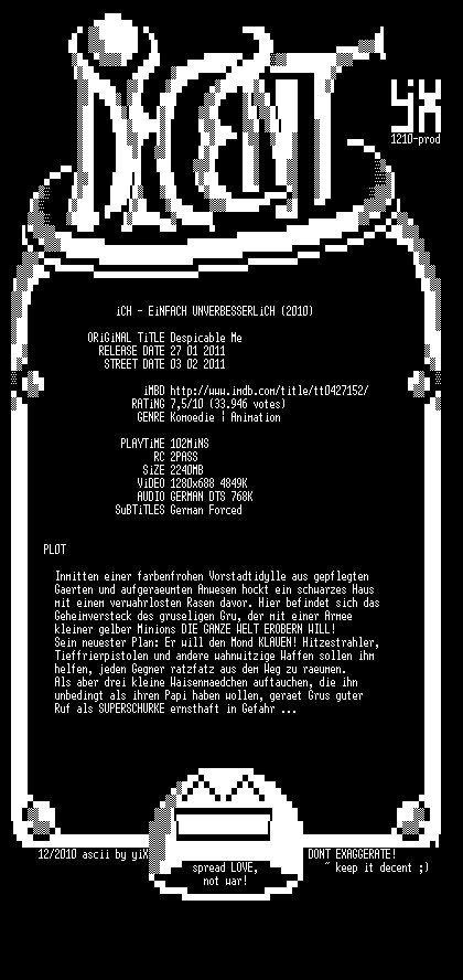 | FiLENAME: | Ich - Einfach unverbesserlich (2010) [GER-dts 720p BD].mkv |
