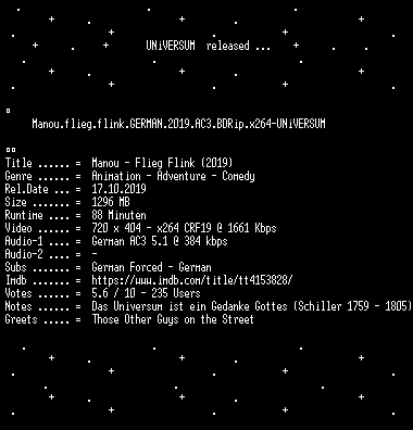 | FiLENAME: | Manou.flieg.flink.GERMAN.2019.AC3.BDRip.x264-UNiVERSUM.mkv |