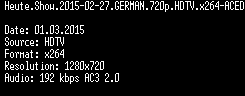| FiLENAME: | Heute.Show.2015-02-27.GERMAN.720p.HDTV.x264-ACED.mkv |
