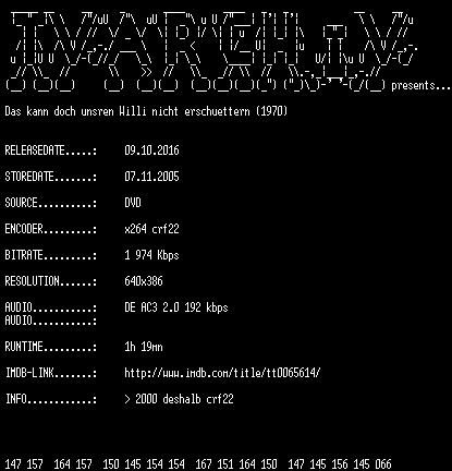 | FiLENAME: | Das.kann.doch.unsren.Willi.nicht.erschuettern.1970.German.DVDRip.x264-TVARCHiV.mkv |