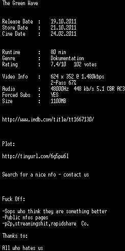 | FiLENAME: | The.Green.Wave.German.AC3.DVDRip.XviD-DiSTRiCT.avi |