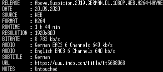 | FiLENAME: | Above.Suspicion.2019.GERMAN.DL.1080P.WEB.H264-WAYNE.mkv |