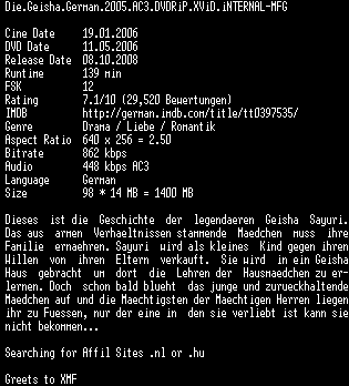 | FiLENAME: | Die.Geisha.German.2005.AC3.DVDRiP.XViD.iNTERNAL-MFG.CD1.avi |
