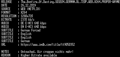 | FiLENAME: | The.Bonfire.Of.Destiny.S01E04.GERMAN.DL.720P.WEB.X264.PROPER-WAYNE.mkv |