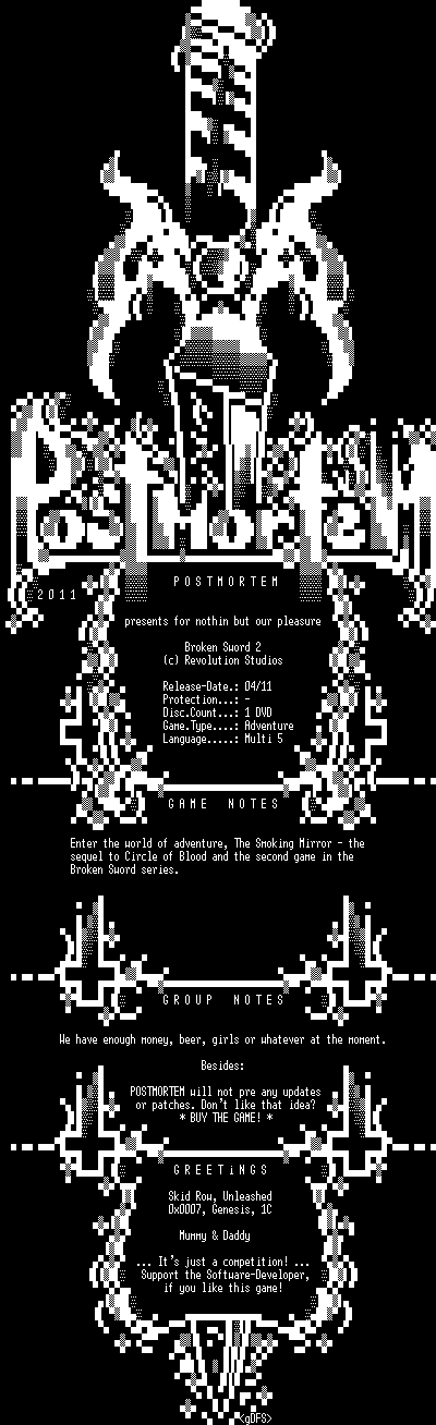 | FiLENAME: | Broken.Sword.2.The.Smoking.Mirror.Remastered-POSTMORTEM.iso |