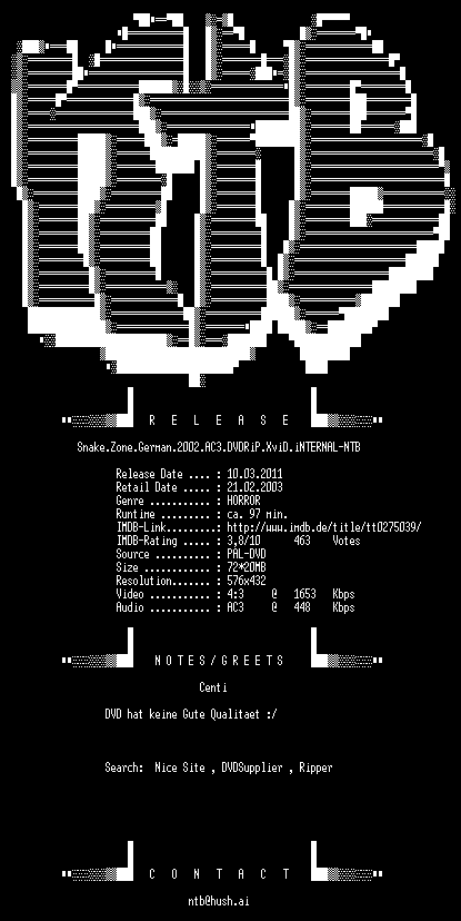 | FiLENAME: | Snake.Zone.German.2002.AC3.DVDRiP.XviD.iNTERNAL-NTB.avi |