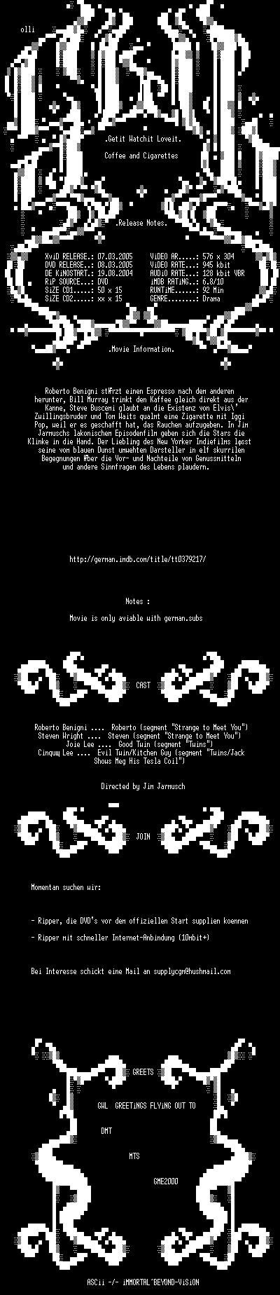 | FiLENAME: | Coffee and Cigarettes (2003) [GER-SUB FS DVD].avi |