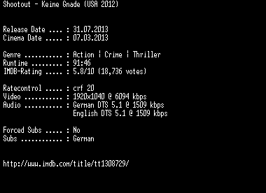 | FiLENAME: | Shootout.Keine.Gnade.2012.German.DL.1080p.BluRay.x264-EXQUiSiTE.mkv |