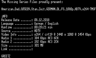 | FiLENAME: | American.Dad.S05E09.Stan.Zeit.GERMAN.DL.FS.1080p.HDTV.x264-TMSF.mkv |