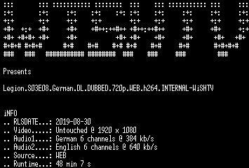 | FiLENAME: | Legion.S03E08.German.DL.DUBBED.720p.WEB.h264.INTERNAL-WiSHTV.mkv |