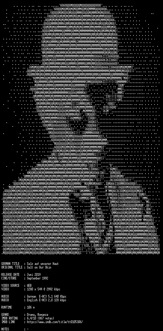 | FiLENAME: | Salz.auf.unserer.Haut.1992.German.DL.720p.WebHD.x264-CLASSiCO.mkv |