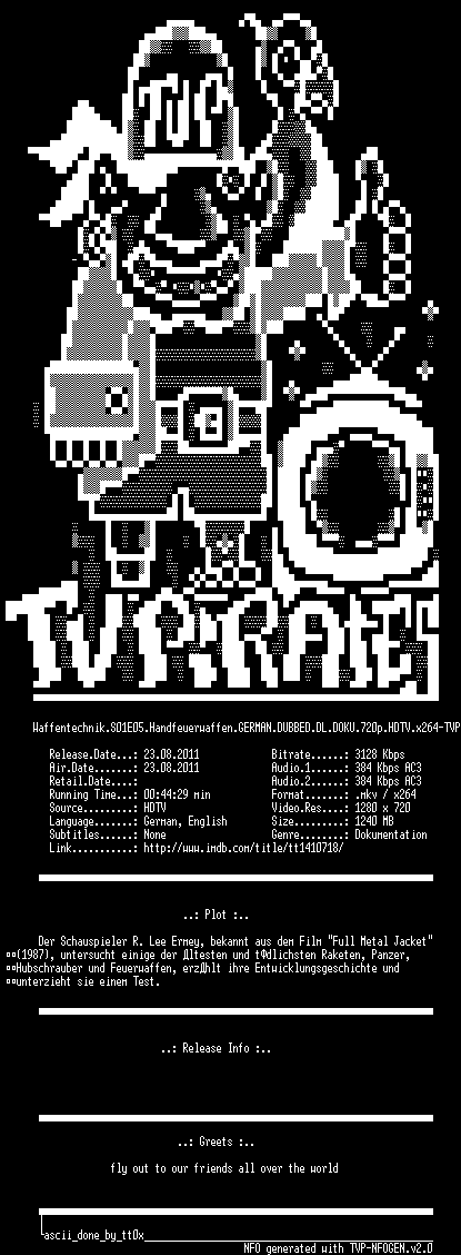 | FiLENAME: | Waffentechnik.S01E05.Handfeuerwaffen.GERMAN.DUBBED.DL.DOKU.720p.HDTV.x264-TVP.mkv |